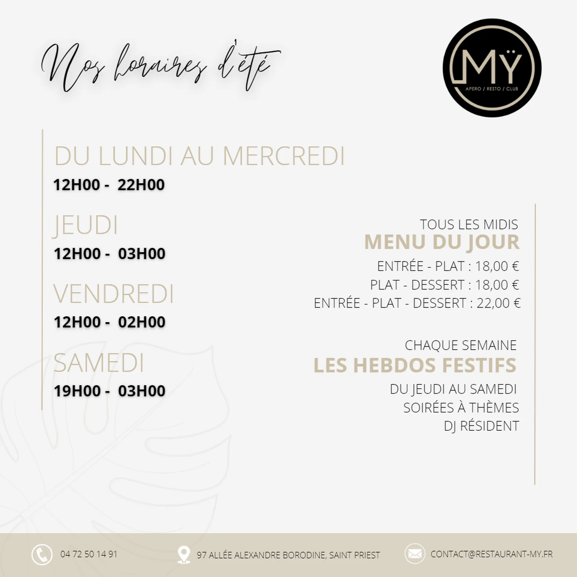 Dès lundi 17 avril 2023, nous serons désormais ouvert du lundi vendredi à partir de midi, NON STOP ! Et le samedi de 19h00 à 3h00 !